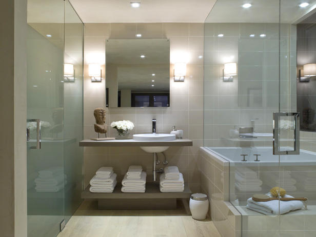 In this not so typical Asian-inspired bathroom, a neutral color palate is chosen to evoke a timeless design. Black high lights on the sink vanity accentuate the details in the Asian-themed artwork and wall covering.